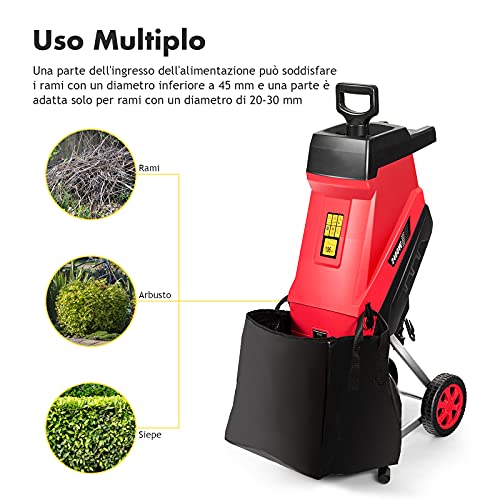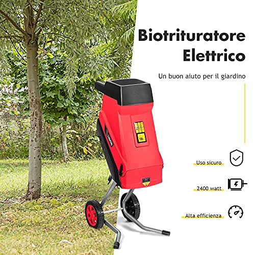 Motore Potente e Lama Affilata – La cippatrice elettrica ha un motore potente di 2400 W e una lama di alta qualità, quindi può triturare efficacemente le varie tipologie di rami e di arbusti. Tali tritumi possono essere utilizzati come fertilizzanti per la coltivazione, realizzando così il riciclaggio.