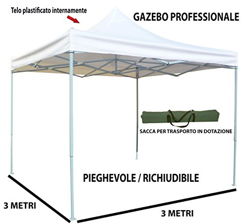 Gazebo pieghevole richiudibile telescopico 3×3 m. telo bianco per mercato fiera manifestazioni sagra campeggio giardino telo plastificato impermeabile anti pioggia