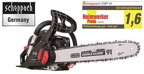 Contenuto della confezione: motosega a benzina Scheppach CSP41 con attrezzo di montaggio, copertura pesante e contenitore per miscelatore in plastica